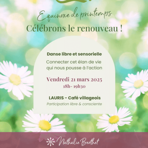 Vendredi 21 mars à 18h Atelier dansé "équinoxe de printemps" par Nathalie Berthet Ensemble, célébrons le printemps et le renouveau qui s'invite 🌸 connectons cet élan de vie qui nous pousse à l'action 🌸 ressentons pleinement cette montée d'énergie dans notre corps qui vient soutenir nos réalisations 🌸 remercions la Vie ! Pour le printemps dansons, ensemble, dansons En participation libre et consciente Exploration dansée à la fois libre et intuitive https://www.nathalieberthet.com/evenement/au-fil-des-saisons-printemps/