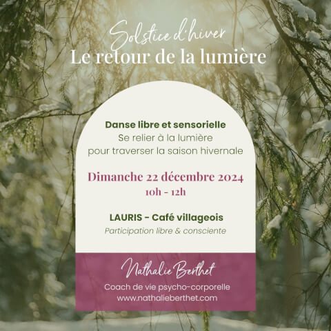 Dimanche 22 décembre de 10h à 12h Atelier dansé "Solstice d'hiver, le retour de la lumière" Ce jour de solstice annonce l'hiver et le retour de la lumière. A partir de cette date, la durée du jour rallonge. Dans de nombreuses traditions, c’était le moment de célébrer la renaissance solaire. Ensemble lors de cet atelier nous allons nous relier à la lumière et l’inviter à nous éclairer pour plus de clarté et de douceur dans nos vies. Par la danse, nous activerons la chaleur du feu en nous pour nous préparer à traverser la période la plus froide de l’année. Ensemble, nous savourerons ce qu’est d’être relié·e au cycle des saisons et les bienfaits de se synchroniser avec la nature. https://www.nathalieberthet.com/agenda/solstice-hiver/ Pour les inscriptions, les personnes peuvent soit m'appeler au 06 62 29 91 14, soit par mail à cafevillageois@gmail.com