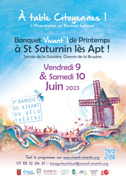A table Citoyen.nes ! L'alimentation en Durance Luberon Banquet VIVANT ! de Printemps à Saint Saturnin Lès Apt Vendredi 9 et Samedi 10 juin 2023 Au terrain de la Gravière, chemin de la Bruyère Un projet co-construit par la mairie de Saint-Saturnin-lès-Apt, Au Maquis, le collectif Transition en pays d’Apt, le Vélo Théâtre, Parc naturel Régional du Luberon en partenariat avec Terre de Liens, Lou Pasquié... Au fil des saisons et de village en village, Vivant ! nous invite à nous retrouver pour des moments conviviaux autour de l’alimentation saine et locale. Une journée pour apprendre, confronter les idées, amener à l’action pour une assiette plus éthique, un évènement joyeux-artistique, une journée savourheureuse ! --------------------- >>> Vendredi 9 juin de 18h30 à 20h30 Entrée libre Soirée-débat “ 4 idées inspirantes sur l’alimentation ” : • Magasins de producteurs • Restauration scolaire • Sécurité Sociale de l’Alimentation • La ferme Terre de Liens : le mas St Joseph à Avignon. Suivie d’un verre et mises en bouche offerts ----------------------- >>> Samedi 10 juin de 10h à 18h Entrée libre Évènement ! Le Moulin de Saint Saturnin Lès Apt reprendra vie le temps de la fête ! Ateliers pour toutes et tous Enfants : Je fabrique mes craies · Je fabrique des pâtes (qui seront dégustées au banquet !) · Découverte & dégustation des fruits & légumes de saison... Enfants et adultes : Je fabrique mes tawashi · Découverte des céréales et légumineuses · Lub’ambule · Mur des possibles · Quizz Fresque du Climat. Adultes : Comment cuisiner les légumineuses ? · Où acheter paysan, local, bio et de saison en pays d’Apt · Présentation Nature et Progrès · Bienvenue à Terre de liens · Découverte de Zou Vaï. Causeries 11h : La Sécurité Sociale de l’Alimentation. 11h & 15h : Agir pour garder des terres et des paysans avec Terre de liens. 15h : Des blés anciens pour un pain santé. 16h : Inventons nos vies bas carbone / Le Projet Alimentaire Territorial du Luberon. 17h : AM’Apt & Sauve qui poule / Alimentation méditerranéenne. Visites · Des jardins partagés de Saint-Saturnin-lès-Apt à 10h30 & 11h30. · Du Moulin de 10h30 à 16h. · De l’exploitation de vignes et cerisiers de Patrick AUGIER à 15h30 & 17h. À 12h Pique-nique tiré du sac / Assiette gourmande et buvette sur place À 19h30 tapantes Sur Réservation Banquet du Vivant mis en scène par le Vélo Théâtre Nous y dégusterons des plats concoctés par Lou Pasquié, sous la houlette du chef Nicolas Daubigney. Nous ferons vibrer nos cordes vocales et nos longueurs d’onde avec Marc Sollogoub. Et pour réveiller nos pulsions dansantes, nous poursuivrons par un Bal endiablé, emmené·es par Marinette Dozeville. À vous, vivant·es ! Réservation indispensable du repas avant le 7 juin à www.velotheatre.com/les-banquets-du-vivant ou directement au Vélo Théâtre à Apt (règlement chèque et espèce) les lundis mardis jeudis vendredis 9h - 18h. 13€ Adulte (entrée plat dessert boisson) / Gratuit -12 ans (pâtes fraîches et cerises) Contact : 07 88 12 36 31 - banquetsaintsat@vivant-vivante.org Toutes les infos : www.vivant-vivante.org