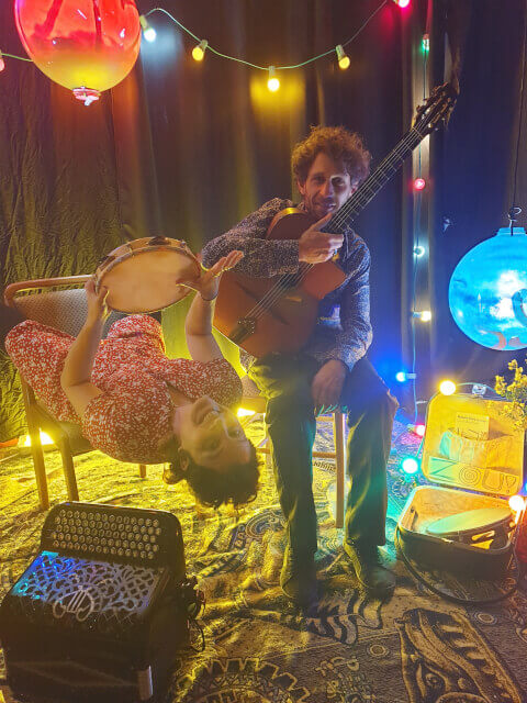 Le groupe s'appelle ZOU ! Rien à voir avec les transports, bien que nous souhaitons tout de même faire voyager les auditeurs à travers notre musique ! Il y fanfaronne un duo composé d'Angelo Burollet (guitare, voix) et Anaïs Ilahiane (accordéon, pandeiro, voix) fraîchement réunis autour de reprises cadencées (Forro, Balkans, Chansons) et de compositions fignolées. Notre désir est de t'inoculer la bamboche Franco Zouguy Trad directement dans les reins. Ça dodeline du pied et ça chaloupe sur des textes envoutés.