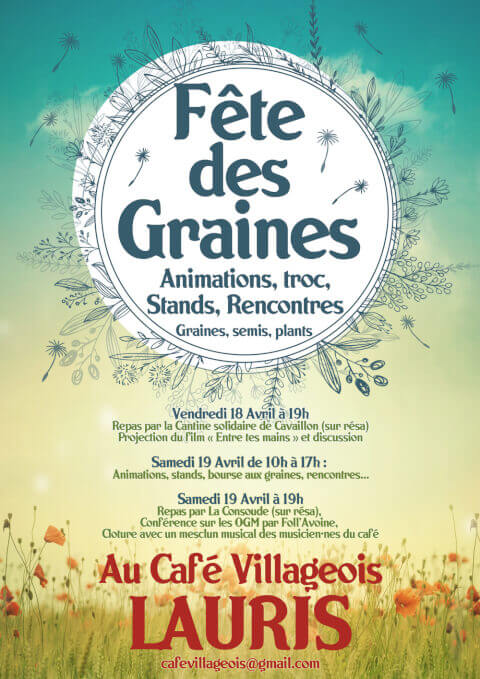 Les vendredi 18 et samedi 19 avril : Fête des graines et des plants ---- -Le vendredi 18 avril à partir de 19h : Repas proposé par la cantine solidaire de Cavaillon (sur resa) et projection du film "Entre tes mains" d'Aurore Émaille, et discussions autour de la semence paysanne. "Entre tes mains" d'Aurore Émaille Il était une fois les semences paysannes, gardiennes de la biodiversité cultivée. Marie les côtoie depuis plus d'une dizaine d’années à neuf cents mètres d’altitude au fond d’une vallée des Alpes-Maritimes; la Roya. À ses yeux, elles sont un trésor précieux de notre civilisation. Agricultrice à l’envie farouche de préserver ce patrimoine immatériel, Marie défend un combat qu'elle ne peut porter seule. Sa force d’action ombrage un rapport très sensible au monde et aux plantes. Comment atteindre alors l’équilibre entre bataille et enchantement, pour trouver un écho au-delà d’une réalité où diversité et autonomie alimentaire sont bouleversées ? Girelle Production 56min 2023 https://vimeo.com/823082476 ---- -Samedi 19 avril de 10h à 17h : animations pour petits et grands, stands et bourse aux graines et aux plants, présentation des différents acteurs du territoire autour de la semence paysanne. ---- -Samedi 19 avril à 19h : Repas par La Consoude (sur resa), conférence et discussion sur les OGM par Foll'Avoine, et cloture le la soirée en musique avec les musicien·nes du café !