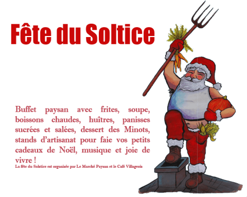 Buffet paysan avec frites, soupe, boissons chaudes, huîtres, panisses sucrées et salées, dessert des Minots, stands d’artisanat pour faire vos petits cadeaux de Noël, musique et joie de vivre ! La fête du Solstice est organisée par Le Marché Paysan et le Café Villageois