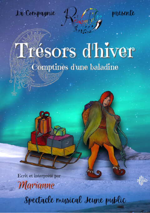 29 janvier à 16h : gouter et spectacle Trésors d'hiver par la cie Rêvambule spectacle jeune public à partir de 3 ans Musique, danse, théâtre, marionnettes, jonglage Nour est une jeune elfe qui avait pour mission de transporter les trésors d'hiver à temps pour Noël, mais elle s'est perdue en chemin, et Noël est déjà passé depuis longtemps... Ce spectacle joyeux et léger embarque les spectateurs dans un l’univers sonore et visuel de l’hiver. www.revambule.fr Gouter partagé à 16h Spectacle à 16h30