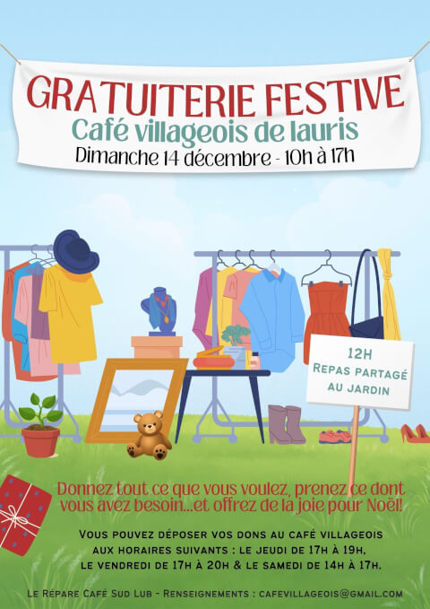 Chacun·e apporte des objets, vêtements, livres, jouets ou tout autre article en bon état que vous offririez volontiers à quelqu’un. On dépose et on se sert... gratuitement ! Venez vivre un moment convivial et la magie d’un Noël solidaire autour d’un déjeuner partagé dans le jardin ! Vous pourrez déposer vos dons le jeudi 12 de 17h à 19h, le vendredi 13 de 17h à 20h et le samedi 13 de 14h à 17h - Organisé avec le Répare Café Sud Lub