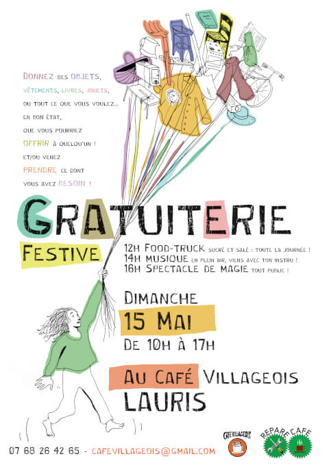 Dimanche 15 de 10h à 17h Gratuiterie festive Apportez des objets à donner, venez prendre des objets ! Comme un vide grenier, mais gratuit ! Donnez des objets, vêtements, livres, jouets, ou tout ce que vous voulez... en bon état, que vous pourriez offrir à quelqu’un ! et/ou venez prendre ce dont vous avez besoin !