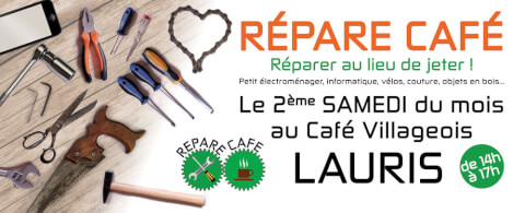 Le Rendez-vous mensuel du Répare Café ! Les 2ème samedis du mois de 14h à 17h Demande d'infos à : contact@reparecafesudlub.fr Venir réparer ou faire réparer vos objets… Venez faire réparer gratuitement ! votre petit électroménager ; matériel électrique ; ordinateur ; tablette ; téléphone ; votre vélo, ou pour des petits travaux de couture ! Plutôt que de jeter à la poubelle, venez faire réparer vos objets ! Grille pain en panne ? téléphone capricieux ? ordinateur qui rame ? poche trouée ? vélo qui déraille ? lampe avec un faux contact ? Un objet par personne ! Le café et sa buvette seront ouverts ! contact@reparecafesudlub.fr