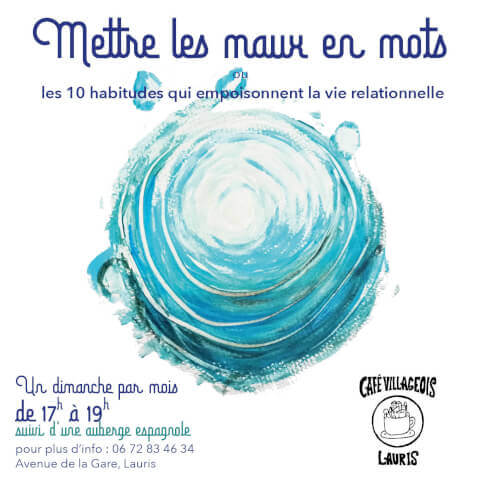 De toutes les expériences pénibles, la dégradation de nos relations est probablement la plus difficile à supporter. Par le jeu de rôles, cet atelier propose de questionner 10 habitudes et ancrer une communication nouvelle pour rétablir de saines relations. OBJECTIF : cultiver de nouvelles habitudes pour que le cerveau les intègre et lâche les anciennes. DESCRIPTION : Après avoir développé les 10 habitudes qui empoisonnent la vie relationnelle (une habitude par mois) cet atelier en groupe utilise le jeu de rôle pour résoudre des situations complexes, tant professionnelles que personnelles. L’enjeu est d’apaiser afin de rendre efficiente la mise en mouvement, en posant un nouveau regard sur la situation évoquée. Atelier mensuel animé par Monia Linossier coach certifiée orienté solution® Un dimanche par mois de 17h à 19h suivi d’une auberge espagnole plus d’info : 06 72 83 46 34 Avenue de la Gare, Lauris