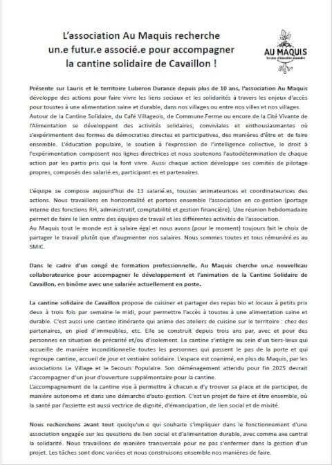 **Au Maquis recrute !** Dans le cadre d’un congé de formation professionnelle, Au Maquis cherche un·e nouvelle·au collaborateur·ice pour accompagner le développement et l’animation de la Cantine Solidaire de Cavaillon, en binôme avec une salariée actuellement en poste. Nous recherchons avant tout quelqu'un·e qui souhaite s’impliquer dans le fonctionnement d'une association engagée sur les questions de lien social et d'alimentation durable, avec comme axe central la solidarité. Nous travaillons de manière transversale pour ne pas s'enfermer dans la gestion d'un projet. Les tâches sont donc variées et nous construisons ensemble nos manières de faire. Pour en savoir + lire le doc https://klhkpm8h.tinifycdn.com/uploads/2025/05/14/19/52/17/recrutement-cantine-2025.pdf et envoies tes motivations avant le 15 juin à aumaquis@gmail.com !