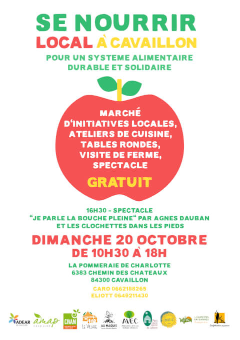 Les associations Au Maquis et AVEC, la Pommeraie de Charlotte et le Parc Naturel Régional du Luberon s'associent durant le festival Vivant ! afin de proposer un événement pour penser ensemble notre système alimentaire du territoire Cavaillonnais. Tables rondes, visite de ferme, ateliers de cuisine et de transformation, marché paysan, spectacle… L'occasion de célébrer notre alimentation locale autour du lancement de l'annuaire CavaMiam ! (www.mangerlocalacavaillon.org) qui répertorie les agriculteur·ices paysan·nes bio du territoire, mais aussi d'imaginer les ponts à tisser des producteur·ices aux mangeur·ses, en passant par les projets de solidarité alimentaire. Gratuit, ouvert à toustes Toute la journée : animations enfants, stands associatifs, buvette 10h30-13h : Grand marché d'initiatives alimentaires locales avec... - Le lancement de CavaMiam !, l'annuaire de la vente locale à Cavaillon. - L'AMAP de Cavaillon - La Cantine solidaire de Cavaillon - Restaurant Le Bio’s - Association Le Village - Le Projet Alimentaire Territoire du Parc Naturel Regional du Luberon ... et l'opportunité de rencontrer les agriculteurs et agricultrices qui nous nourrissent ! 10h30 - 13h : Ateliers de cuisine 11h30 : Visite de la pommeraie de Charlotte avec la productrice 13h : Repas partagé 14h : Atelier-causerie « se nourrir local à Cavaillon » avec des producteurs, mangeur.ses et projets de solidarité alimentaire 16h30 : Spectacle tout public « Je parle la bouche pleine ! » par Agnès Dauban et Les Clochettes dans les pieds. Récits paysans du Luberon. “Comment raconter le lien intime, cellulaire à la terre ? Comme si on la comprenait avec tout notre être, comme s’il y avait un dialogue... Comment raconter la sensation d'une journée de tracteur dans le corps avec tout ce qui passe ? l'oiseau, l'arbre qu'on regarde en se disant qu'on ne l'avait pas vraiment vu jusque-là et tout ça en étant très concentré sur ce qu'on fait tout en écoutant la radio et en sentant la température, en appréciant la lumière et la couleur du ciel avec les nuages et en se demandant quand la pluie reviendra…” Collectage de paroles paysannes dans le Sud Luberon Collecteurs : Agnès Dauban et Marco Rullier Conteuse : Agnès Dauban Musiciennes : « Les Clochettes dans les pieds » Durée : 1 heure Tout public ! Producteurices, mangeureuses, projets alimentaires, curieux.ses ! Infos pratiques : A La Pommeraie de Charlotte 3232 Chemin des Châteaux 84300 Cavaillon Sans réservation Contact : contact@aumaquis.org / 06.62.18.82.65 / 06.49.21.14.30 Partenaires : Au Maquis, AVEC, La Pommeraie de Charlotte, Parc Naturel Régional du Luberon, Le Village, AMAP de Cavaillon, les Clayettes Paysannes de Cheval-Blanc, Alliance locale des solidarités, Caisse Locale d’Alimentation de Cadenet, GEMvrac, Anatoth