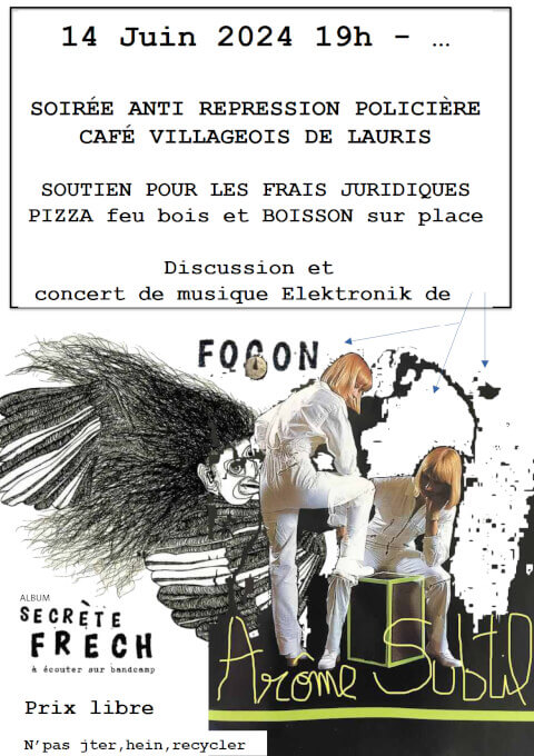 Vendredi 14 juin à partir de 19h Soirée anti repression policière Soutien pour les frais juridiques Pizza feu de bois par la caillasse et boissons sur place Discussion et concert de musique Elektronik de FOCON et AROME SUBTIL Prix libre